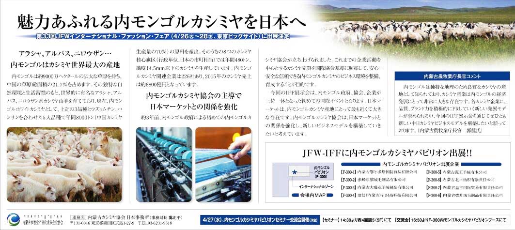 2016419日,內(nèi)蒙古自治區(qū)農(nóng)牧業(yè)廳廳長郭健在IFF報(bào)紙上寄語此次活動(dòng),希望自治區(qū)羊絨企業(yè)積極推進(jìn)以創(chuàng)新、品質(zhì)、品牌為核心的發(fā)展新模式。充分利用各個(gè)平臺(tái)廣泛交流,探討合作途徑,推動(dòng)兩國羊絨行業(yè)多方共贏,共同提升全球市場對(duì)羊絨產(chǎn)品的認(rèn)知度,希望我們的羊絨企業(yè)能團(tuán)結(jié)一致,實(shí)現(xiàn)羊絨產(chǎn)業(yè)的可持續(xù)發(fā)展。通過這次活動(dòng),走出一條中日羊絨產(chǎn)業(yè)創(chuàng)新之路。