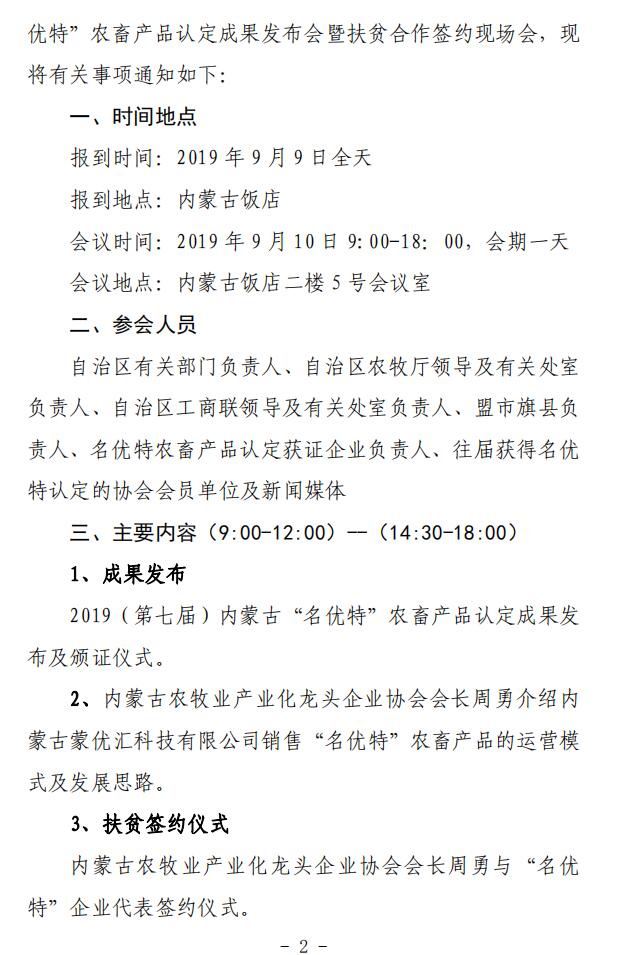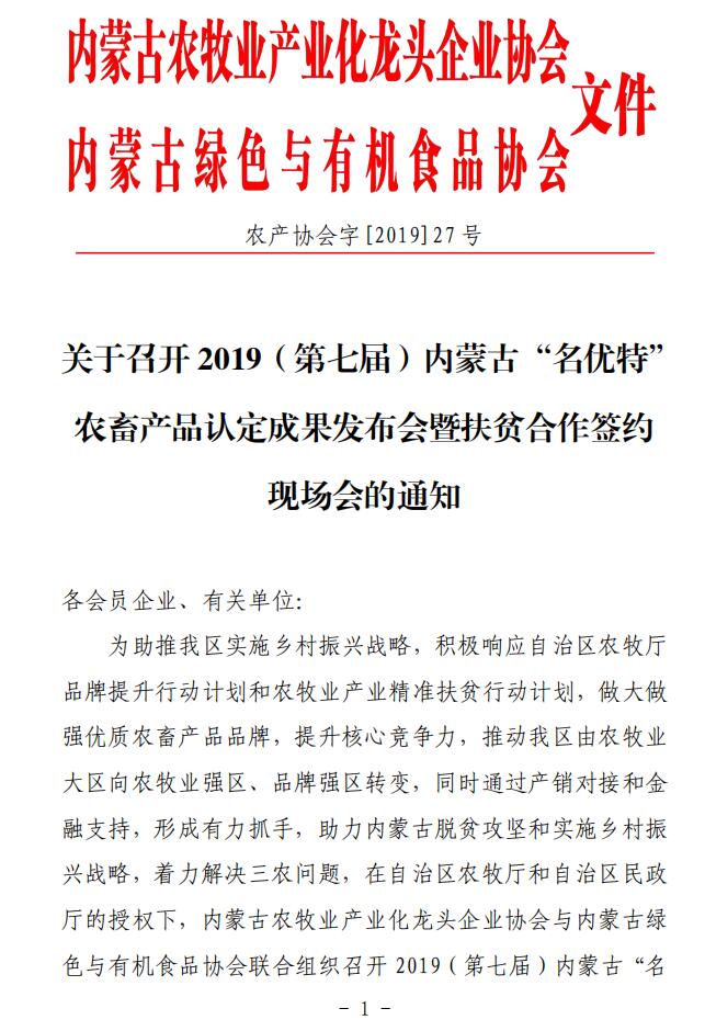 標題:關于召開 2019(第七屆)內(nèi)蒙古“名優(yōu)特” 農(nóng)畜產(chǎn)品認定成果發(fā)布會暨扶貧合作簽約 現(xiàn)場會的通知