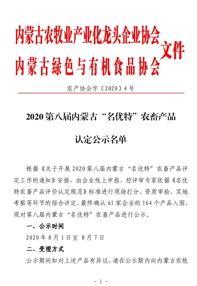 標(biāo)題:2020第八屆內(nèi)蒙古“名優(yōu)特”農(nóng)畜產(chǎn)品認(rèn)定公示名單