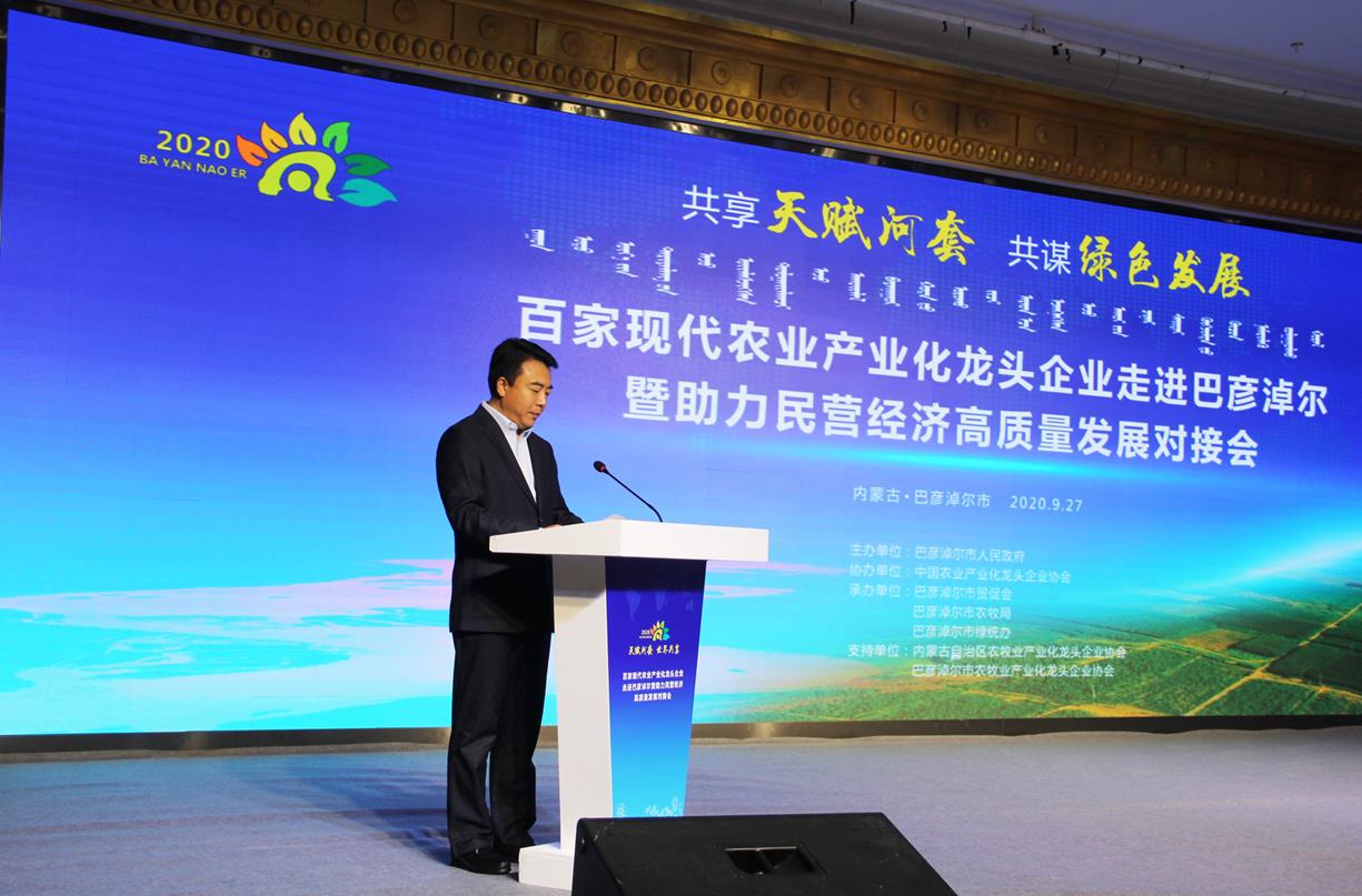 9月27日,由巴彥淖爾市人民政府主辦,中國農(nóng)業(yè)產(chǎn)業(yè)化龍頭企業(yè)協(xié)會協(xié)辦,巴彥淖爾市貿促會、巴彥淖爾市農(nóng)牧局、巴彥淖爾市綠統(tǒng)辦承辦,內蒙古農(nóng)牧業(yè)產(chǎn)業(yè)化龍頭企業(yè)協(xié)會、巴彥淖爾市農(nóng)牧業(yè)產(chǎn)業(yè)化龍頭企業(yè)協(xié)會支持,以“共享‘天賦河套’·共謀綠色發(fā)展”為主題的百家現(xiàn)代農(nóng)業(yè)產(chǎn)業(yè)化龍頭企業(yè)走進巴彥淖爾暨助力民營經(jīng)濟高質量發(fā)展對接會在巴彥淖爾市臨河區(qū)召開。中國農(nóng)業(yè)產(chǎn)業(yè)化龍頭企業(yè)協(xié)會會長劉身利,中國農(nóng)科院紀檢組組長史志國,內蒙古自治區(qū)黨委巡視二組駐巴彥淖爾市優(yōu)化營商環(huán)境專項工作組副組長董躍飛,巴彥淖爾市委副書記、市長張曉兵,市人大常委會主任閆鵬,市委副書記、政法委書記李中增,市委常委孫艾芳、王志平出席會議,副市長任逸群作市情推介,內蒙古農(nóng)牧業(yè)產(chǎn)業(yè)化龍頭企業(yè)協(xié)會會長周勇應邀出席會議。
