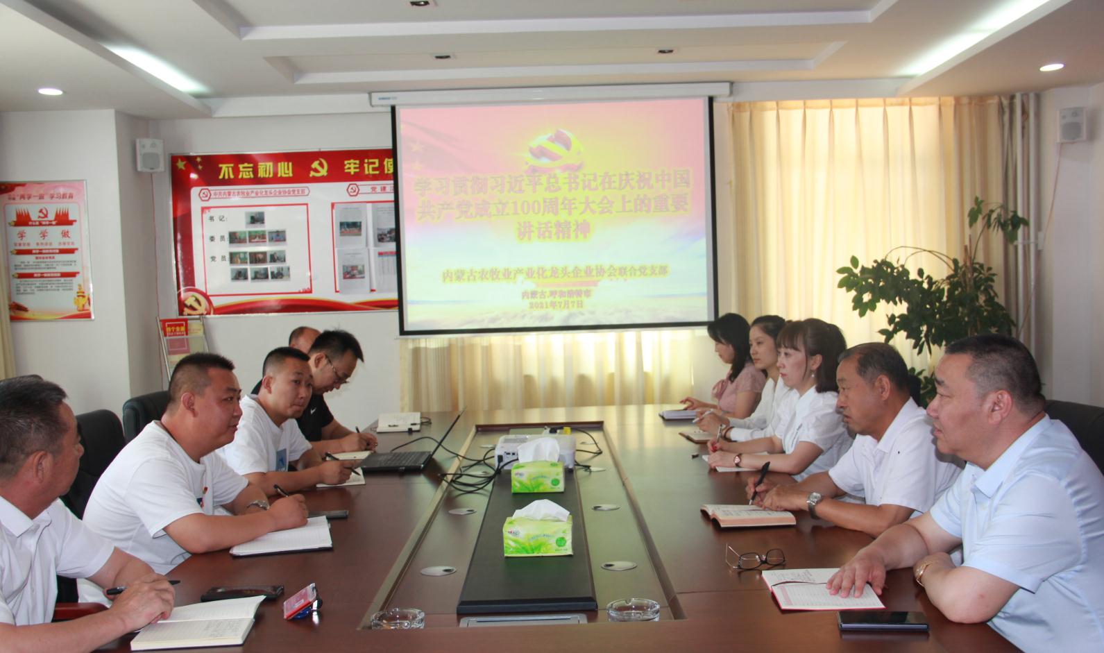 2021年7月7日上午,內(nèi)蒙古農(nóng)牧業(yè)產(chǎn)業(yè)化龍頭企業(yè)協(xié)會(huì)聯(lián)合黨支部書記李陽主持召開“學(xué)習(xí)貫徹習(xí)近平總書記在慶祝中國共產(chǎn)黨成立100周年大會(huì)上的重要講話精神”座談會(huì)。協(xié)會(huì)會(huì)長(zhǎng)周勇,執(zhí)行會(huì)長(zhǎng)林永亮,執(zhí)行秘書長(zhǎng)呼群等所有在呼黨員干部參加會(huì)議。