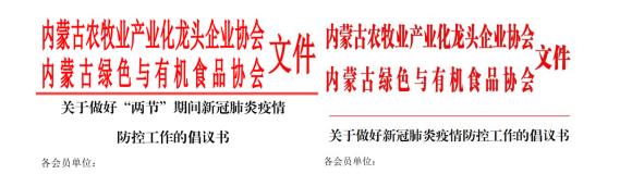 一、內蒙古農牧業(yè)產業(yè)化龍頭企業(yè)協(xié)會聯(lián)合內蒙古綠色與有機食品協(xié)會,先后發(fā)布了《關于做好“兩節(jié)”期間新冠肺炎疫情防控工作的倡議書》和《關于做好新冠肺炎疫情防控工作的倡議書》,引導各會員單位堅決遏止借機囤積居奇、哄抬物價、虛假宣傳等破壞市場秩序、損害消費者合法權益的不法行為,堅決遏制疫情擴展蔓延,積極投身新型冠狀病毒防控戰(zhàn)役中。