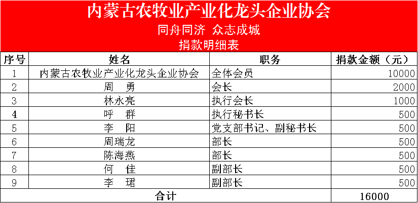 三、“一方有難,八方支援”,截止目前,在協(xié)會會長周勇的帶領下,協(xié)會秘書處共募集抗疫捐款1.6萬元,結合地方所需,已于2月23日以現(xiàn)款形式捐贈給呼和浩特市紅十字會,用于呼和浩特市疫情防控工作。