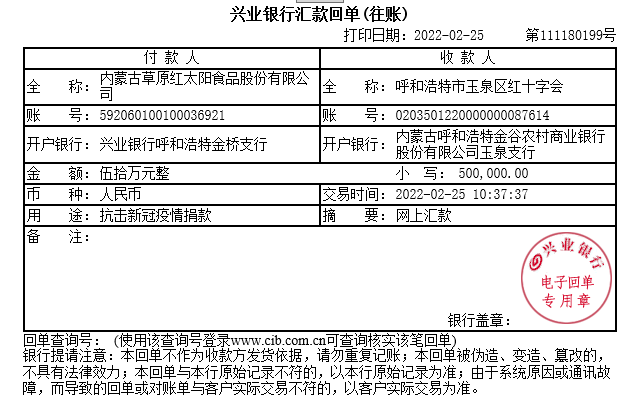 18、會員單位-內蒙古草原紅太陽食品股份有限公司:2022年2月25日,紅太陽公司向呼和浩特市紅十字會捐款50萬元,用于抗擊新冠疫情。