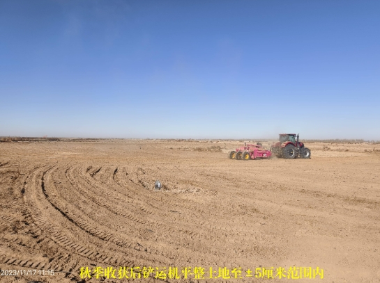 2、磴口縣巴彥套海農(nóng)場機械隊地塊屬于2022年高標準農(nóng)田項目區(qū),渠、溝、路、林、田配套到位?;緸閷?00米、長700米的“條形”土地,激光平整土地誤差在3厘米內(nèi)。2023年全部種植中苜4號和美國騎士苜蓿,年內(nèi)平茬收獲2次,現(xiàn)已澆灌冬季保墑水,是認證和發(fā)展有機苜?;氐睦硐胫?。