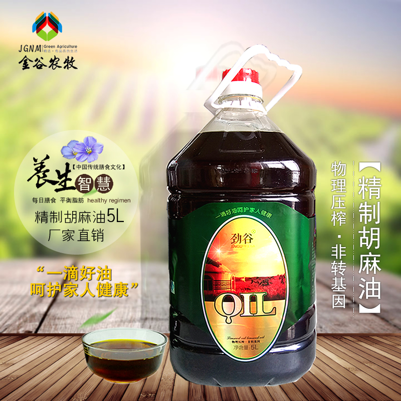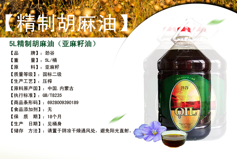 產(chǎn)品名稱:勁谷精制胡麻油5L 內(nèi)蒙古胡麻油 廠家直銷 物理壓榨胡麻油