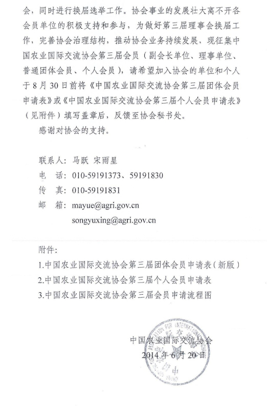 轉(zhuǎn)發(fā)關(guān)于征集中國(guó)農(nóng)業(yè)國(guó)際交流協(xié)會(huì)第三屆會(huì)員的函
