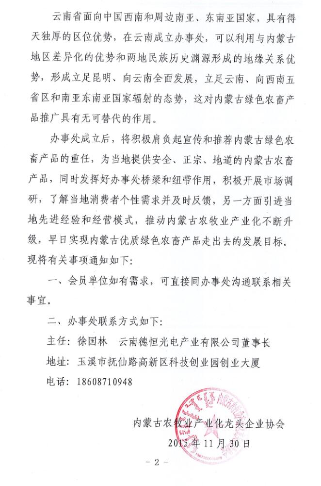 關(guān)于成立內(nèi)蒙古農(nóng)牧業(yè)產(chǎn)業(yè)化龍頭企業(yè)協(xié)會(huì)云南辦事處的通知