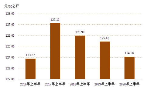 1.小麥:1、2月份春節(jié)假期疊加新冠肺炎疫情,糧企停工停產(chǎn),市場(chǎng)交易趨于平淡,小麥?zhǔn)召弮r(jià)格整體穩(wěn)定。3月份之后,隨著新冠肺炎疫情得到有效控制,各地復(fù)工復(fù)產(chǎn)復(fù)學(xué)的大范圍推進(jìn),截止12月份全區(qū)小麥每50公斤平均收購價(jià)格為124.06元,同比下降1.09%,詳見圖3(來源:內(nèi)蒙古自治區(qū)發(fā)展和改革委員會(huì))