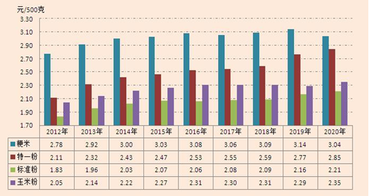 6   內(nèi)蒙古自治區(qū)20122020年主要成品糧零售價(jià)格對(duì)比圖