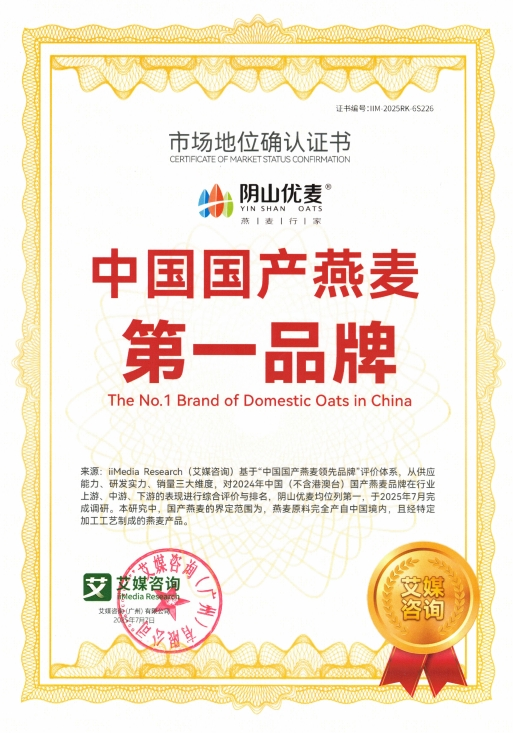 2025年7月,內(nèi)蒙古陰山優(yōu)麥?zhǔn)称酚邢薰精@得權(quán)威咨詢機構(gòu)艾媒咨詢(iiMedia Research)頒發(fā)的“全球裸燕麥第一品牌”與“中國國產(chǎn)燕麥第一品牌”市場地位確認(rèn)證書。同時,其創(chuàng)新產(chǎn)品“低GI五黑燕麥片”亦被權(quán)威認(rèn)證為全球開創(chuàng)者,標(biāo)志著陰山優(yōu)麥在全球燕麥行業(yè)取得突破性成果。